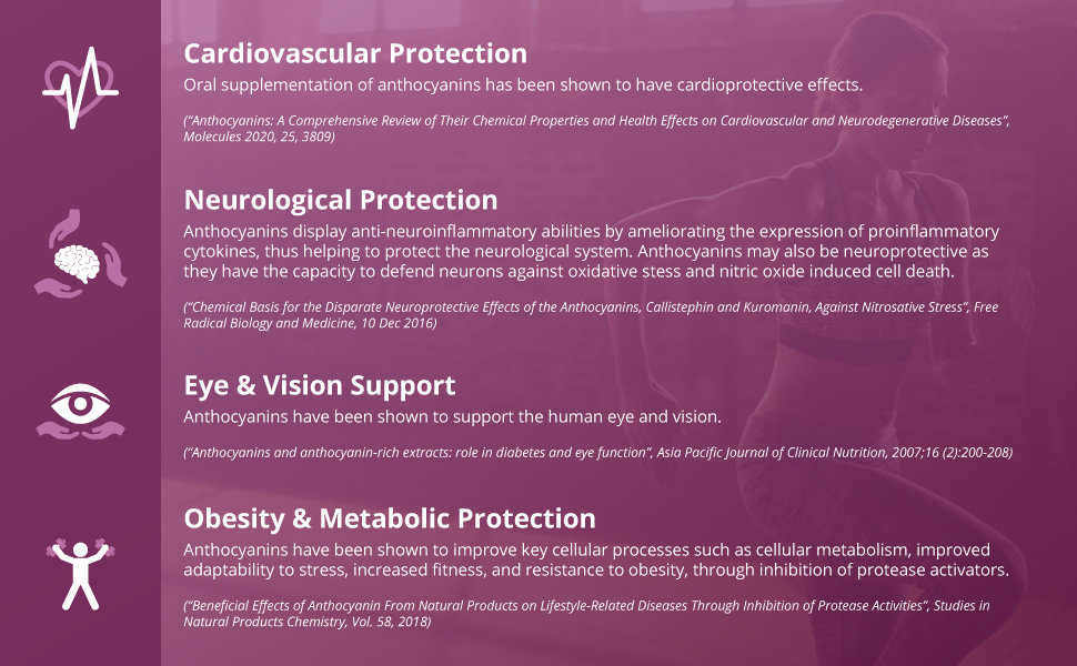 Anthocyanins are colored flavonoids, which are phenolic compounds, that are natural pigments responsible for the purple, blue, and red colors of many fruits, vegetables, flowers, and other types of plants. Anthocyanins make blueberries blue, raspberries red, and purple corn purple. The word “anthocyanin” is derived from the two Greek words anthos (meaning flower) and kyanos (meaning blue). Our Fermented Purple Corn Extract is standardized to a 10% anthocyanin formulation, meaning that each 1,000 mg serving (2 capsules) of our Fermented Purple Corn Extract contains 100 mg of anthocyanins.