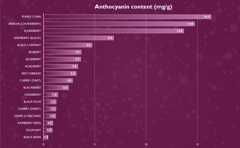 Purple corn also has a higher anthocyanin content than other well-known superfoods such as arnoia (chokeberry), elderberry, black raspberry, black currant, bilberry, acai berry, and tart cherry.